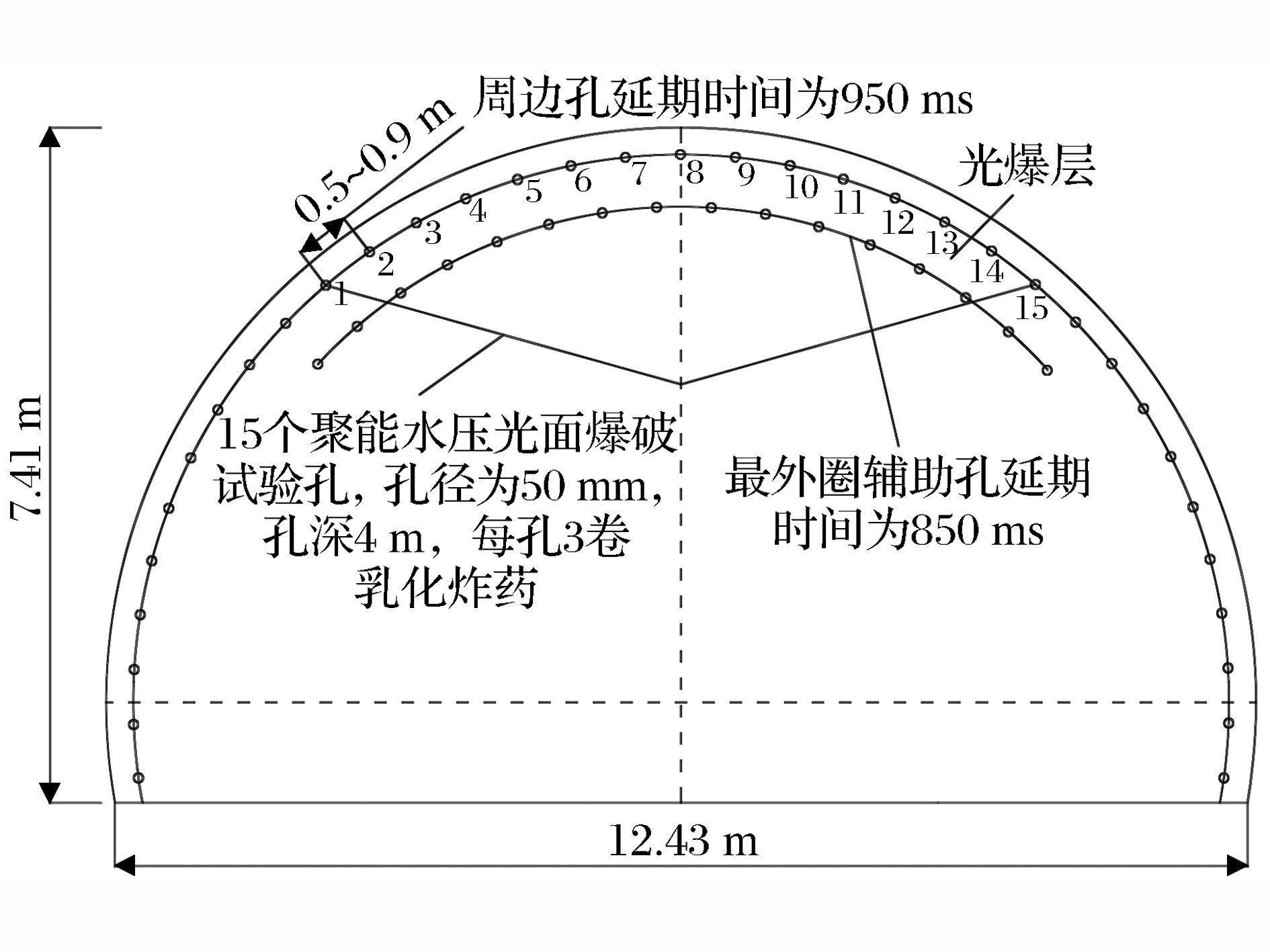 针对传统光面爆破技术在隧道Ⅳ级和Ⅴ级软弱围岩中应用时常出现的超挖和进尺率低等问题,基于聚能水压光面爆破技术的原理及应用现状,设计了一种轴向多孔聚能管,通过将管内水袋、药卷交替间隔搭配导爆索和数码电子雷管形成一体化聚能水压装药结构,并在云南勐省隧道Ⅳ级围岩区域开展了连续装药光面爆破、水袋间隔光面爆破、空气间隔光面爆破和聚能水压光面爆破4种试验。爆后使用测距仪、卷尺和标杆对循环进尺、半孔率和超欠挖等爆破技术指标进行测量。试验结果表明:前3种试验的半孔率依次为13%、45%和38%,一个循环进尺依次为3.40 m、3.50 m和3.45 m,轮廓面围岩破碎存在超欠挖现象,而采用一体化装药结构的聚能水压光面爆破后的半孔率达62%,一个循环进尺为3.60 m,试验区域轮廓线比较平整,没有明显的超欠挖现象。现场应用结果表明:新型一体化聚能水压爆破在软弱围岩隧道周边轮廓平整度控制中效果显著,在减少钻孔数量和炸药量的同时,保持了围岩的完整性,是一种环保、节能的控制爆破技术。