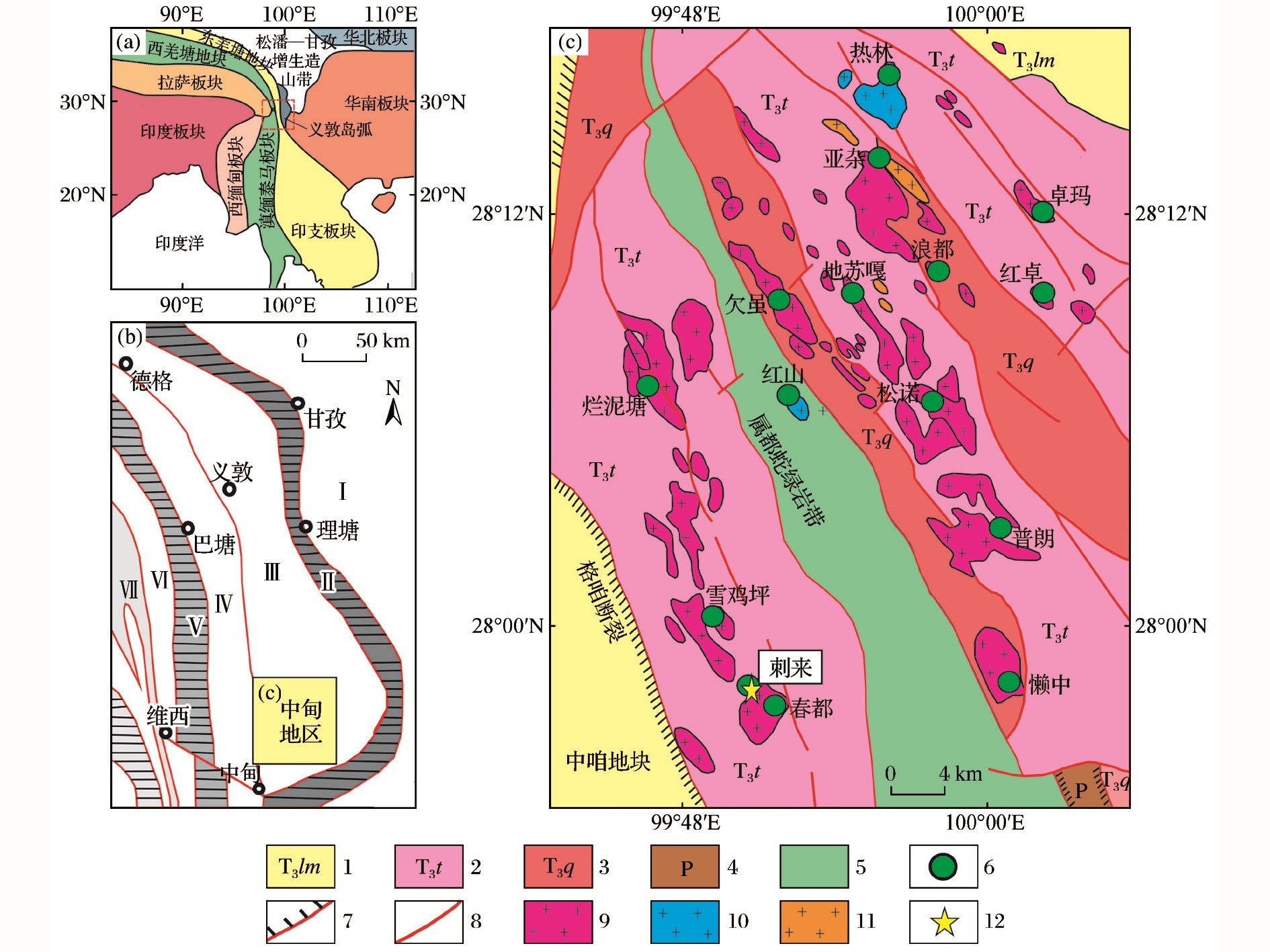 滇西北中甸地区位于三江特提斯成矿域,该区新发现的刺来复式斑岩体具有重要成矿意义。刺来岩体石英闪长玢岩具高硅[w(SiO₂)=64.94%~67.31%]、富碱[w(K₂O+Na₂O)=7.27%~8.84%]特征,属于高钾钙碱性系列岩石。地球化学组分揭示其富集轻稀土[(La/Yb)N=33.11~39.41]和大离子亲石元素(Rb、Ba、Th、U),显著亏损高场强元素(P、Ti、Zr),呈现高Sr(692×10⁻⁶~1 180×10⁻⁶)、低Y(11.7×10⁻⁶~13.1×10⁻⁶)、高Sr/Y比值(56.7~100)和La/Yb比值(48.7~58.0),符合埃达克(质)岩的地球化学特征。刺来岩体整体Th/U比值偏高(0.56~1.24),MgO(1.11%~2.69%)、Cr(12.2×10⁻⁶~18.6×10⁻⁶)和Ni(4.3×10⁻⁶~5.8×10⁻⁶)含量较低,Th/La比值(0.15~0.20)和Nb/Ta比值(13.6~15.2)介于地幔与地壳端元间,揭示其岩浆源区存在俯冲洋壳熔体与地幔熔体的混合作用。MgO-Fe₂O₃-Al₂O₃图解及构造判别图解显示,该岩体形成于岛弧环境;锆石U-Pb定年显示其结晶年龄为(217.0±1.8)~(216.9±1.4)Ma,属晚三叠世岩浆活动的产物。刺来岩体与中甸斑岩成矿带内春都、雪鸡坪等大型斑岩矿床同属晚三叠世甘孜—理塘洋壳西向俯冲背景下的产物。