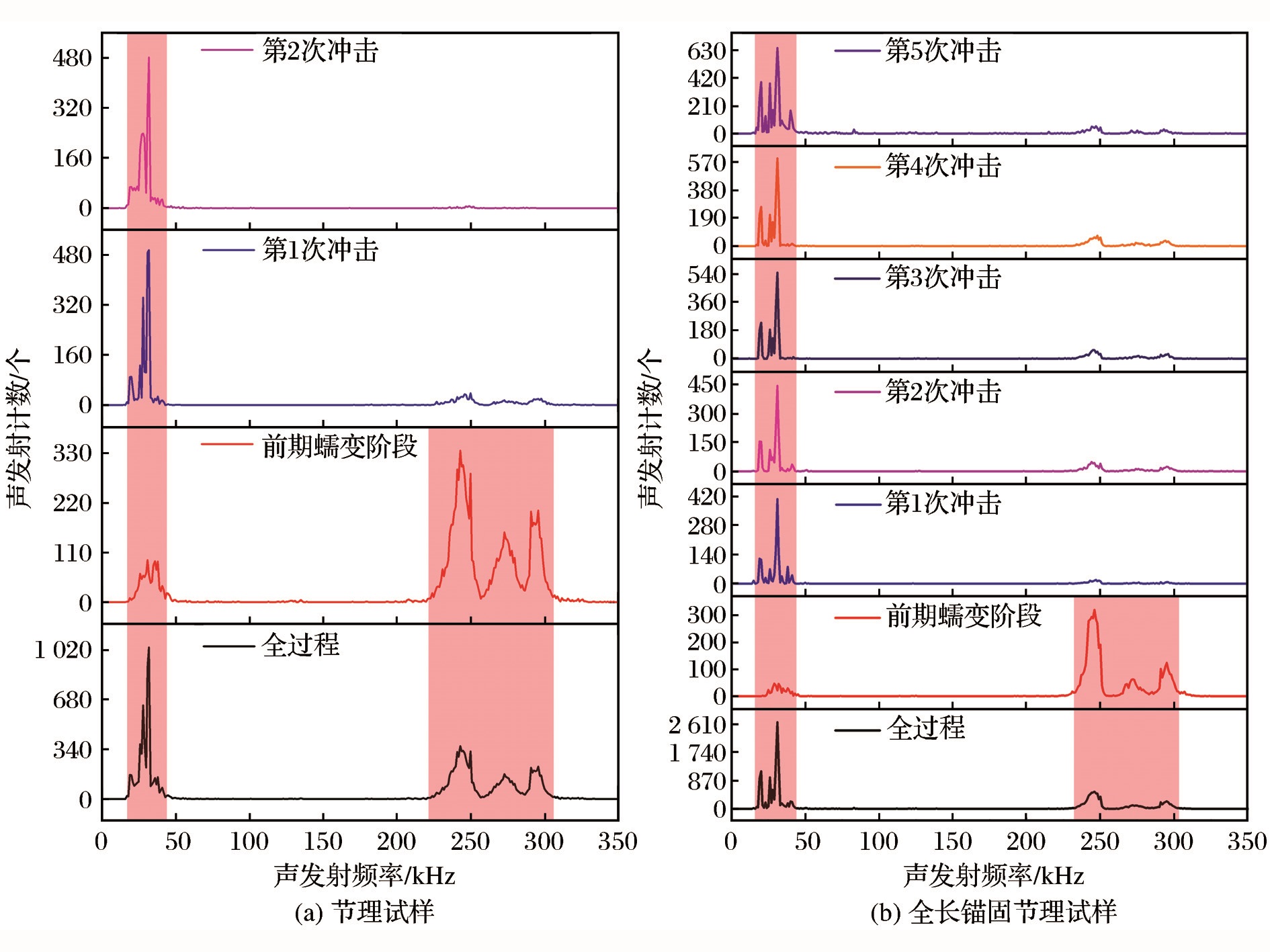 实际工程中锚固体经历多应变率的力学作用致使其锚固效应劣化,探究蠕变—冲击作用下节理试样的锚固力学效应,对于科学设计锚固支护方案具有重要意义。采用分布式光纤传感与声发射监测技术相结合的方法,对锚固节理试样开展蠕变—冲击试验,分析锚杆全程应变响应和岩体损伤破裂的演化规律。结果表明:锚杆应变整体呈“等腰三角形”分布,节理处锚杆应变集中系数达2.3,说明节理处为关键薄弱区;锚杆变形增量随着冲击次数的增加呈现“小—大—小”非单调演化规律,蠕变—冲击耦合作用下锚固体经历“弹性强化—弹塑性过渡—锚固失效”3个不同演化阶段;岩体在蠕变阶段以拉伸微裂纹扩展为主导,冲击阶段以剪切破裂为主导,锚杆通过抑制节理剪切错动提升节理岩体的整体稳定性。
