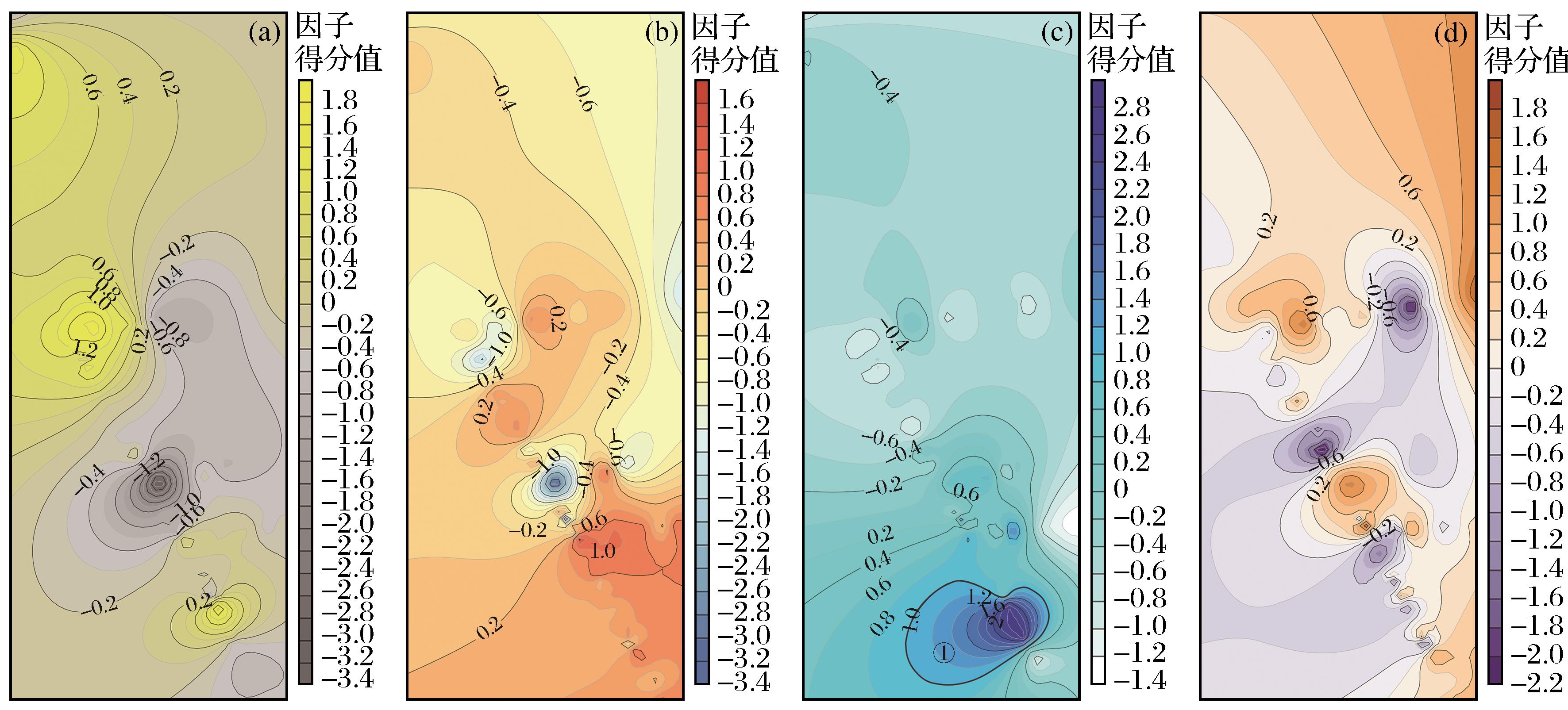 (a)F1因子组合构造地球化学图;(b)F2因子组合构造地球化学图;(c)F3因子组合构造地球化学图;(d)F4因子组合构造地球化学图;(e)F5因子组合构造地球化学图;(f)F6因子组合构造地球化学图