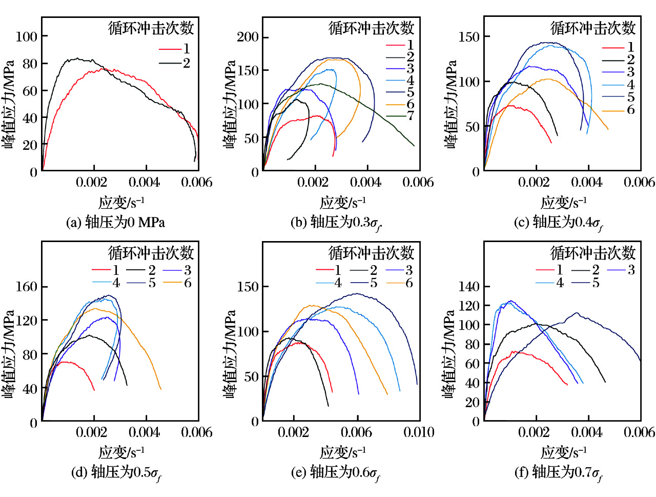 为探究地下工程开挖过程中外部荷载对周边围岩多重扰动作用的影响,进一步开展岩石在动静组合作用下的循环冲击试验研究,通过改进式SHPB试验装置研究含横向贯通孔洞花岗岩(φ50 mm×50 mm)在循环冲击荷载下的动态力学特性,采用轴压水平分别为0MPa,0.3σf,0.4σf,0.5σf,0.6σf,0.7σf进行循环冲击试验(σf为单轴平均抗压强度,单位为MPa)。结果表明:在冲击荷载作用下,峰值应力随着冲击荷载作用次数的增加先增大后减小,并随着平均应变率的增大而增大;弹性模量随着冲击次数的增加先增大后降低,在不同轴压水平作用下试件冲击破坏形态均为轴向劈裂破坏模式;随着应变速率增大,破裂面逐渐增多,破碎程度加剧,碎块尺寸减小;应变率较小时,破碎效果不明显,应变率较大时,破碎效果显著。
