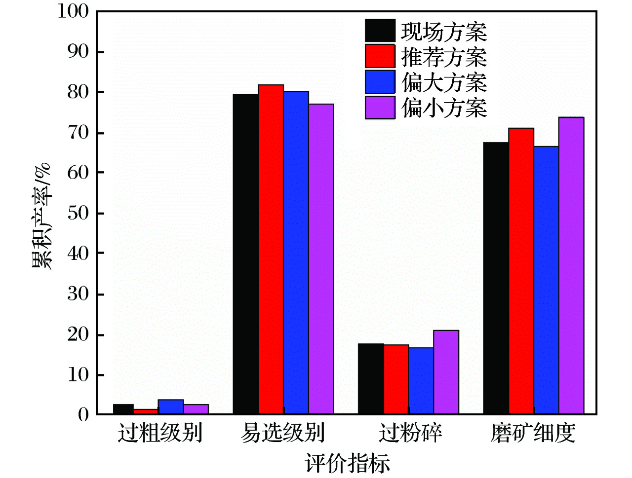 针对江西某铜矿选厂大型球磨机磨矿产品质量差、处理量低、运转率低和能耗高等问题,在测定矿石力学性质的基础上,采用控制变量法,通过对比多组实验室试验方案的磨矿效果,最终确定球磨机的最佳介质制度为φ60∶φ50∶φ40∶φ30=30∶25∶30∶15。试验结果表明:推荐钢球方案较现场方案过粗粒级级别产率降低了1.21个百分点,中间易选粒级级别产率提高了2.53个百分点,过粉碎粒级级别产率减少了0.32个百分点;较钢段方案过粗粒级、磨矿细度-0.074 mm占比和中间易选级别产率分别提高了4.58个百分点、1.48个百分点和3.25个百分点,对比工业试验前后矿石月处理量提高了13 242 t,运转率提高了2.18个百分点,月功率降低了173 kW。研究表明:优化磨矿介质制度不仅可以提高磨矿产品质量,而且对节能降耗具有重要的促进意义,有助于提升公司核心技术水平,对同类型矿山具有借鉴意义。