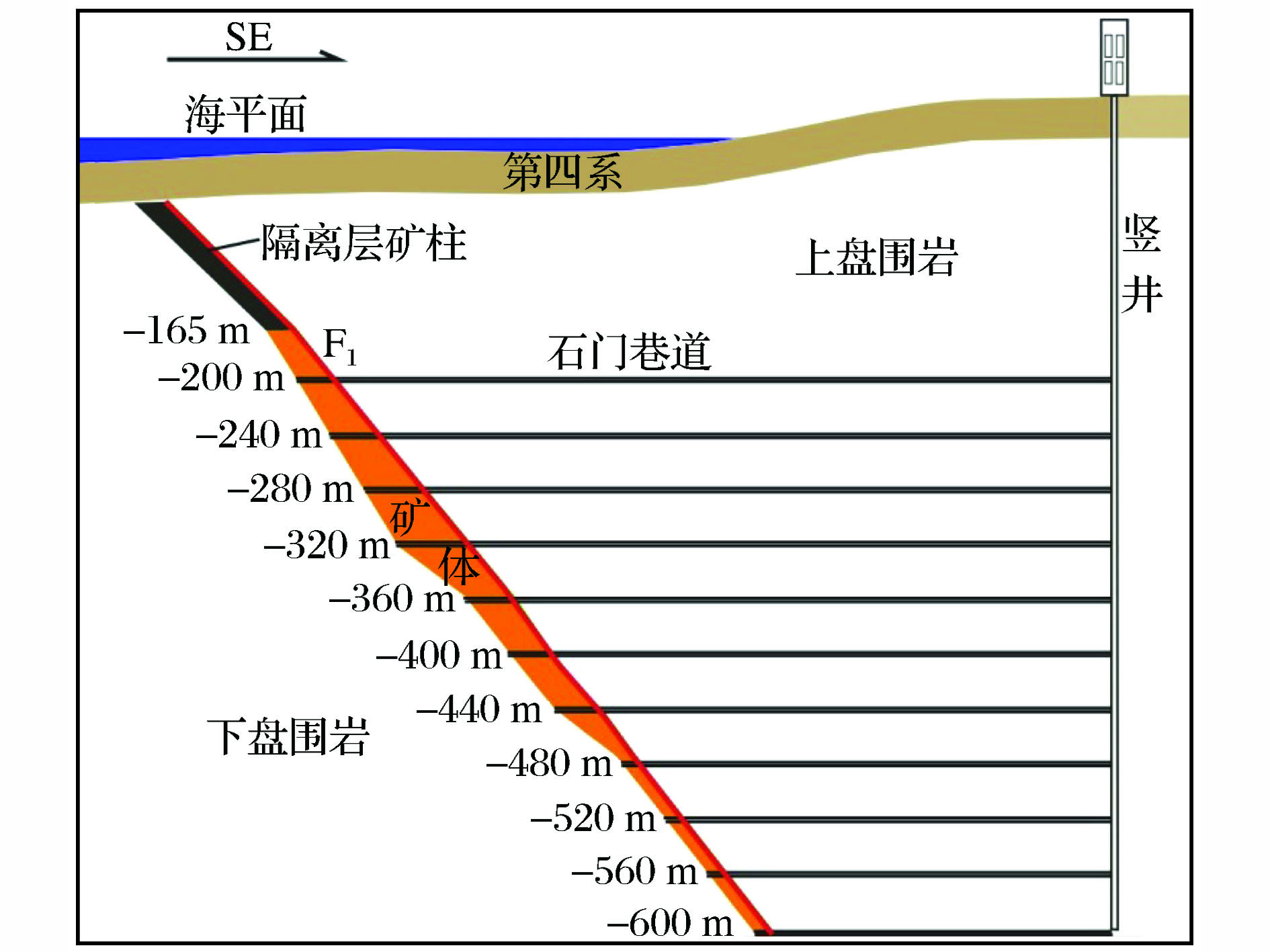 三山岛金矿新立矿区是我国首例实施海底开采的金属矿山。为了研究新立矿区井下矿体围岩变形破坏特征,以与矿体走向垂直的55号勘探线为监测剖面,通过布设井下四等水准监测系统,对55号勘探线剖面内不同深度开采中段巷道顶板围岩的垂直位移进行了长期监测。分析结果表明:(1)海底不同深度各中段矿体开采引起的变形均表现为对上盘岩体的影响范围大,而对下盘岩体影响范围小,越靠近矿体(或控矿断层F1)部位,顶板围岩的下沉量越大;(2)各中段的累积沉降量曲线总体上表现为不对称漏斗形,其中较浅部的-200 m中段与-240 m中段累积沉降量曲线底部较为平缓,呈近似“锅”状,而深部的-320 m、-400 m、-480 m和-600 m中段沉降曲线呈“漏斗”状;(3)新立矿区矿体厚度、开采深度、开采强度、围岩岩性、围岩岩体结构以及充填效果是影响海底倾斜矿体开采围岩变形的因素,其中,矿区内控矿断层F1的存在直接影响围岩变形曲线的形态。