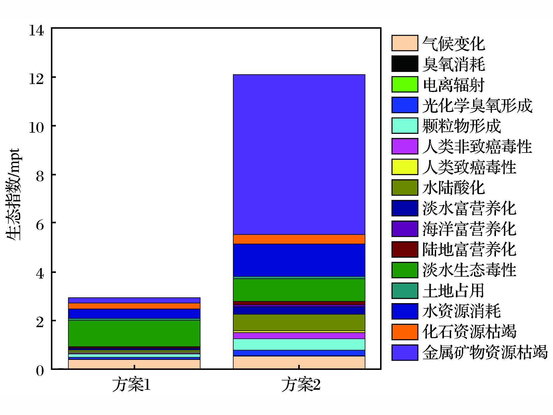 以含氰黄金尾矿无害化处理过程为研究对象,运用生命周期评价(LCA)方法构建了2种方案的评价模型,对尾矿压滤洗涤、滤渣处理和滤液处理的环境负荷及资源消耗进行定量评估。结果表明:(1)方案2的尾矿毒性水平比方案1降低了98.5%,但整体环境影响并未降低;(2)方案1的主要环境问题是淡水生态毒性,方案2中环境影响从大到小依次是资源枯竭、淡水生态毒性和人类毒性等;(3)方案1中芬顿降硫氰和尾矿干堆是影响整体环境的主要环节,尾矿干堆对人类非致癌毒性和淡水生态毒性贡献超过50%,方案2中尾矿芬顿脱氰在14个环境影响指标中都是核心问题。2种方案中使用的大量化学药剂是主要的环境影响要素,电能影响较小。与方案1相比,方案2出现环境影响转移,体现在环境影响的形式与关键环节发生变化。从整体环境影响来看,尾矿的处理思路可以朝着药品减量和使用清洁环保物质方向发展。