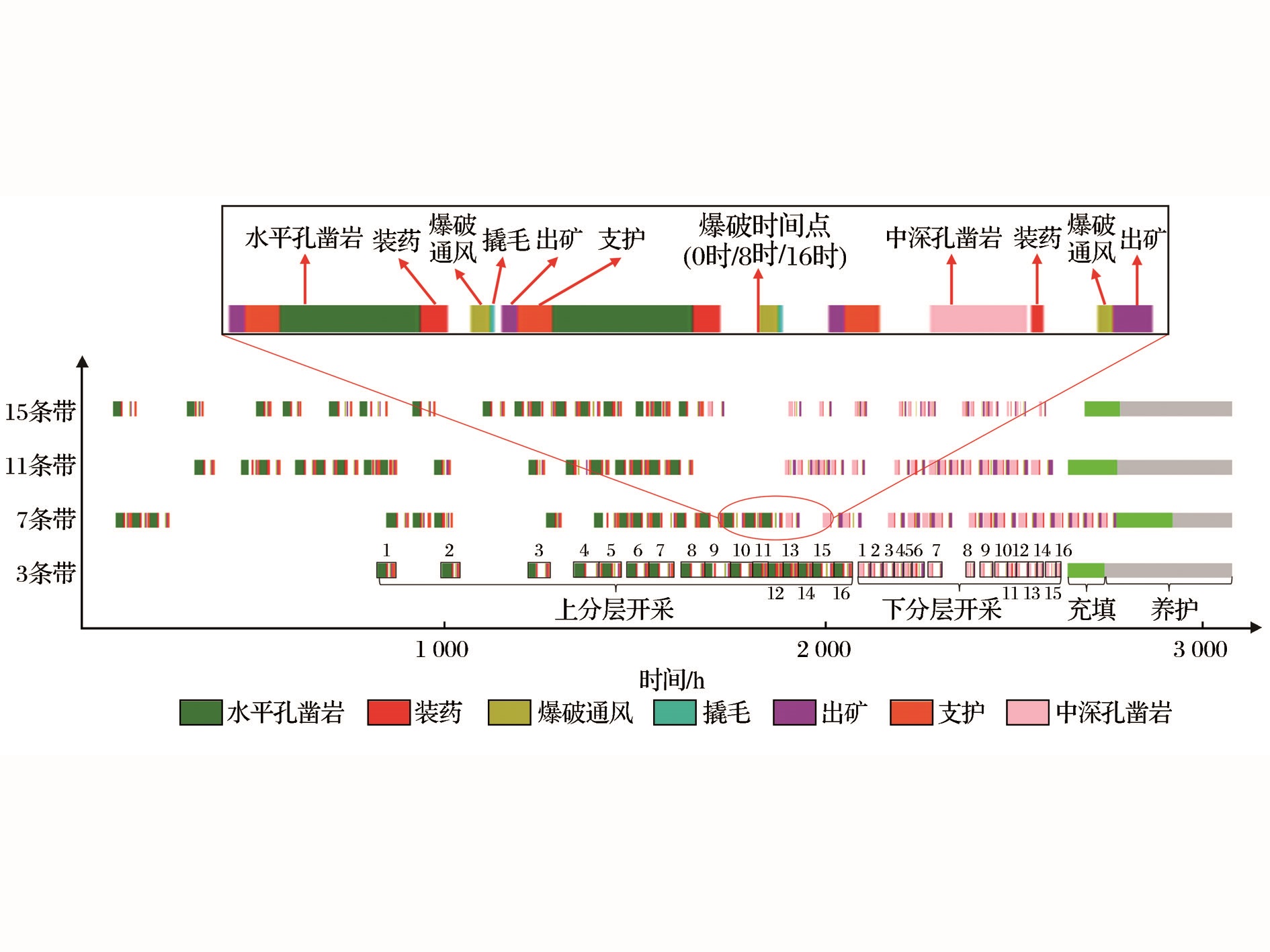 To investigate the influence of blasting disturbances on the surrounding rock of stopes in deep environments, this study developed a numerical model of a deep stope featuring staged longhole drilling, utilizing the discrete element method platform (PFC3D) and based on the engineering conditions of a hard rock mine in southern China. A five-row fan-shaped blast hole configuration was designed, and numerical simulations of millisecond-delayed blasting were conducted. The findings indicate that distinct dynamic response characteristics are observed in various zones of the surrounding rock under multi-row blasting conditions. Notably, the particle vibration amplitudes in the goaf sidewalls initially increase and subsequently decrease as the blast hole row spacing increases. Additionally, the vibration of the roof shows a marked reduction when the spacing exceeds 1.5 meters, whereas the row spacing between 1.0 and 1.5 meters has a relatively minor effect. Significant vibration accumulation is anticipated on the bench face and free surface. Cumulative deformation damage is primarily observed in the left abutment, bench face, and roof of the goaf under blasting loads, while the right abutment exhibits minimal damage. A distinct strip-shaped damage zone is evident on the left abutment, and large-scale rock collapse is likely on the bench face. Field validation corroborates substantial collapse risks in the roof strata and localized damage zones in the left abutment, aligning with numerical predictions. This study offers practical guidance for optimizing blasting design and mitigating disaster risks in deep hard rock mining operations.