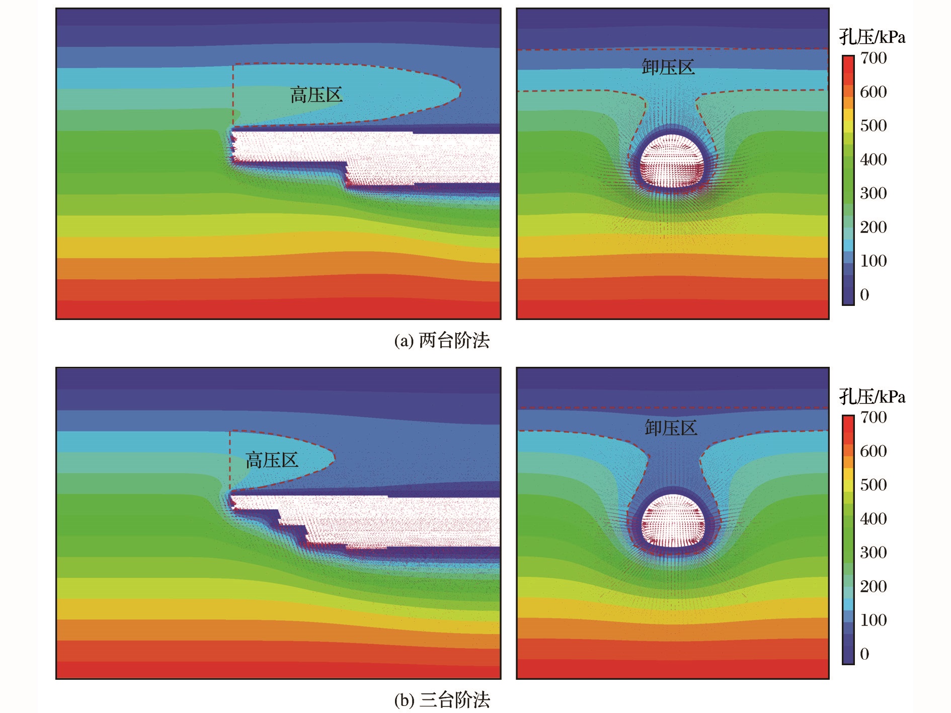 To address the technical challenges associated with the design and construction of large-section single tunnels in water-rich basalt with tuff strata, such as the determination of construction methods and support parameters, a comprehensive study was conducted. This study was based on a new high-speed railway tunnel project in Yunnan Province and employed engineering investigation, field monitoring, and numerical simulation to examine the deformation and control technology of the surrounding rock. The results indicate the following:(1)Implementing initial support immediately after excavating the upper bench using the two-bench method significantly reduces the crown settlement rate, achieving a final settlement of approximately 38.5 mm, thereby effectively limiting further deformation of the arch base.(2)During excavation, horizontal deformation is concentrated at the arch foot and waist. After excavation, the maximum horizontal displacement shifts downward to the arch wall, with the affected area expanding outward in a butterfly-like pattern. In the two-bench method, the monitoring points at the upper and middle benches exhibit greater clearance convergence values and rates compared to the three-bench method, whereas the lower bench shows smaller values. Additionally, the rapid closure of the invert in the two-bench method results in superior deformation control.(3)Tunneling through strata with high water content creates a dewatering funnel, where groundwater seeps out along the tunnel face and benches. The two-bench method reduces the initial support closure time, leading to decreased dewatering. However, it results in the formation of a high-pressure zone above the crown.(4)The installation of additional drainage pipes can mitigate the load on the lining structure. Furthermore, the integration of mechanized construction techniques with the two-bench method has approximately doubled the average monthly construction progress.
