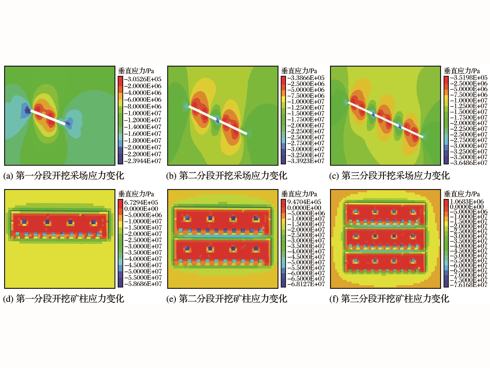 The aim of this study is to determine the optimal width of mine pillars that ensure stability under room-and-pillar mining conditions. A phosphorus mine in Guizhou serves as a case study for this investigation. The research integrates theoretical analysis, numerical simulation, and on-site monitoring to examine the load-bearing mechanisms of mine pillars and their appropriate widths within the context of room-and-pillar mining. Additionally, the study explores the impact of pillar width on quarry stability and validates the proposed optimization plan for pillar dimensions through simulation tests and practical engineering applications. The findings indicate that, following the initial excavation of the quarry, the maximum vertical displacement of the quarry’s roof plate varies at each stage. The displacement distribution is predominantly symmetrical along the quarry’s center line and decreases progressively towards the sides of the center line. As the excavation of the mining pillar advances through each phase of the quarrying process, a positive correlation is discerned between the displacement changes within the quarry and the exposed quarry area. Simultaneously, the displacement of the peripheral rock overlying the quarry demonstrates a gradual reduction along the left and right sides of the quarry’s center line. The displacement and settlement values of the surrounding overlying rock progressively decrease along these sides, culminating in a final displacement pattern that resembles an ‘arch’ shape. Following the excavation of each stage of the ore body, a high-stress region emerges within each stage of the mine pillar and the mining airspace. The quarry’s mine pillar enters a yield state, with the vertical stress on the quarry’s roof plate being significantly lower than that on the mine pillar. Tensile stress predominantly occurs around the mining airspace. The maximum vertical displacement and settlement value, as well as the maximum vertical stress value of the quarry, are recorded at 41.5 mm and 76.17 MPa, respectively. Notably, there is no significant plastic damage to the mine pillar, with damage being confined to localized areas. Empirical evidence from field engineering practice indicates that the theoretical analysis supporting an 8-meter pillar width is justified. Throughout the various phases of the ore body re-mining process, the displacement and settlement of the mine pillar remain minimal, with a recorded maximum displacement of 13.37 mm and a peak stress of 3.45 MPa, the reby confirming the pillar’s stability. These findings offer valuable theoretical insights and technical support for the safe and efficient extraction of phosphorus mines under analogous conditions.