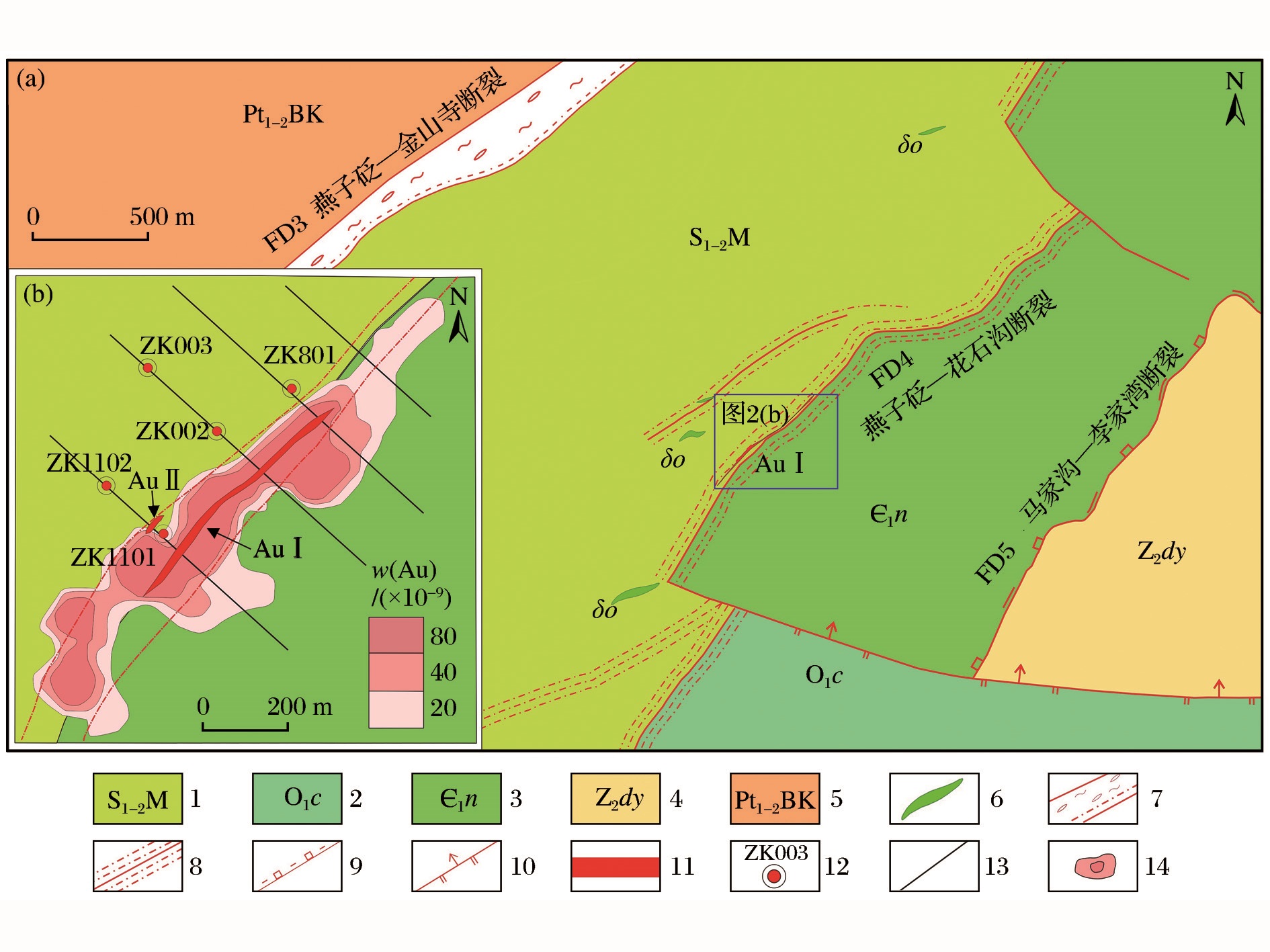 In recent years, substantial advancements have been achieved in the exploration of gold deposits within the Back-Longmenshan tectonic belt, which boasts a resource of approximately 50 tons. The Xinjiazui gold deposit, a newly identified site within this belt, exhibits medium to large prospecting potential. The gold deposits are predominantly located within the northeast-trending Yanzibian-Huashigou brittle-ductile shear zone, with the formation of ore bodies and mineralized bodies being stringently governed by these shear zones. The host rock primarily comprises iron bearing magnesite spotted phyllite and carbonaceous silica slate. The predominant ore type is quartz vein, and the mineralization alterations closely associated with gold include silicification, pyritization, and minor arsenopyritization.While previous researchers have made certain advancements in the study of this ore deposit, there remains a relative paucity of research focused on its mineralogical aspects. This study, grounded in comprehensive field investigations, concentrates on the gold-bearing minerals pyrite and arsenopyrite. Utilizing methodologies such as microscopic observation, back-scattered electron(BSE) imaging, and electron probe micro-analysis(EPMA), the research aims to elucidate the mineralogical characteristics of these gold-bearing minerals, investigate the occurrence state of gold, and determine the physical and chemical conditions of mineralization, as well as the genesis of mineral deposits. The findings indicate that the hydrothermal mineralization process can be categorized into three distinct stages: Stage Ⅰ, characterized by quartz-pyrite formation; Stage Ⅱ, defined by quartz-calcite-natural gold polymetallic sulfide, development; and Stage Ⅲ, marked by quartz-carbonate, formation, with Stage II being identified as the principal mineralization phase. Pyrite is classified into three generations:the sedimentary diagenesis stage(Py0), the early mineralization stage(Py1), and the main mineralization stage(Py2), during which arsenopyrite coexists with the main stage pyrite. Gold is present in two forms: visible gold and invisible gold. Visible gold appears in the main mineralization stage of pyrite as encapsulated and fractured gold. The occurrence of invisible gold exhibits distinct variations. During the sedimentation and early mineralization stages, gold within pyrite is present as nano gold(Au0). In contrast, during the main mineralization stage, pyrite contains both nano gold(Au0) and lattice gold(Au+). In arsenopyrite, all gold exists exclusively as lattice gold(Au+). The Xinjiazui gold deposit was formed under medium-high temperature conditions at a moderate to considerable depth, with f(S2) values ranging from -8.5 to -4.5. When compared to typical ductile shear zone-type gold deposits in the Longmen shan orogenic belt, and considering the geological and geochemical characteristics, it is inferred that the Xinjiazui gold deposit is an orogenic gold deposit influenced by brittle-ductile shear zones.