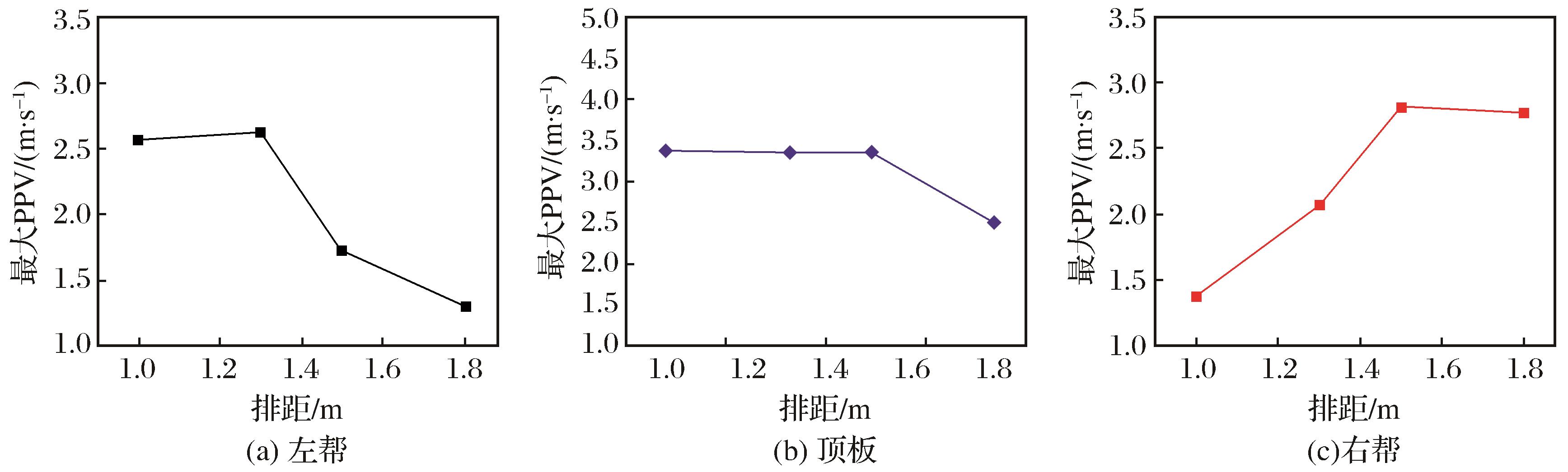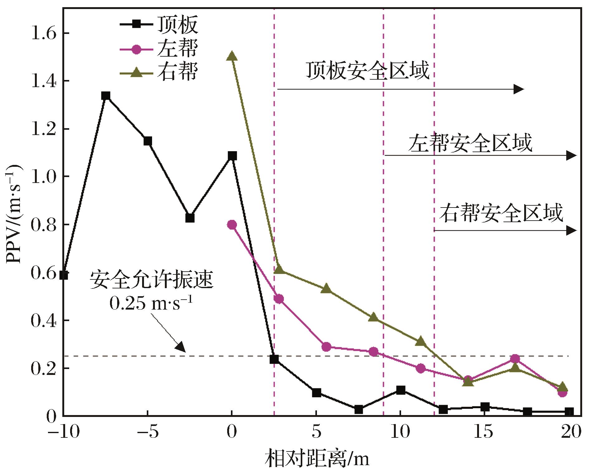 Schematic distribution of peak vibration velocity(PPV) at different relative positions