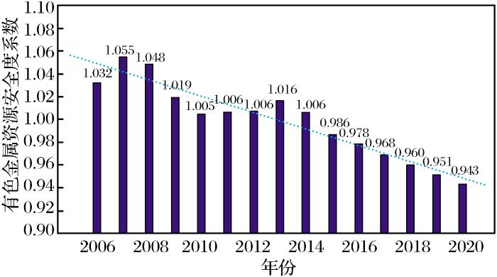 湖南省2006~2020年有色金属资源供需安全度系数