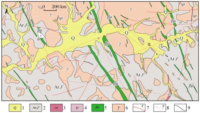 1.第四系冲积物、洪积物;2.阜平群混合岩化条带状片麻岩夹斜长角闪岩;3.石英斑岩;4.花岗细晶岩;5.辉绿岩;6.粗粒钾长文象花岗岩;7.断层;8.推测断层;9.地质界线
