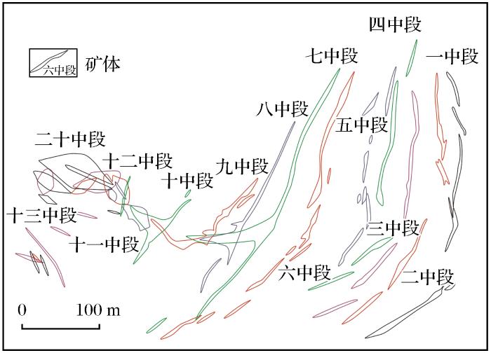 浅部主矿体特征与深部矿体特征不同。浅部矿体主要呈脉状产于NNE向断裂带(及其旁侧断层)的蚀变角砾岩中。矿体总体受断裂带控制,可见尖灭再现和尖灭侧现现象。金矿体在平面上呈现向东南突出的弧形带状,北段走向近SN,南段转向NE。单个矿体形态为不规则脉状,矿体连续性好,产状变化中等,矿体厚度变化较稳定,厚度一般为2~5 m,平均厚度为3.53 m,属于厚度稳定型矿体。