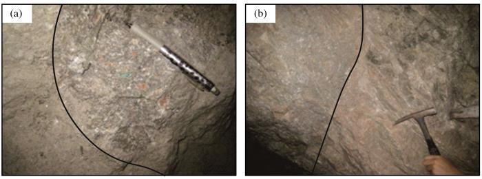 (a)矿体呈角砾状,角砾为钾长花岗岩,强烈硅化、绢云母化和黄铁矿化;(b)矿体底板特征,围岩为钾长花岗岩,边界清楚但愈合良好