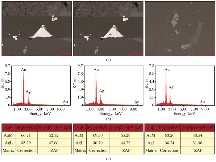 由上述分析可知,矿区金矿物成分以金和银为主,含少量铋。金和银的相对含量为(583~678)