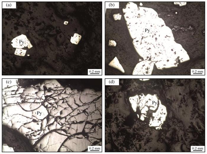 (a)细粒黄铁矿;(b)粗粒黄铁矿;(c)黄铁矿表面碎裂;(d)黄铁矿呈交代残余结构;Py-黄铁矿