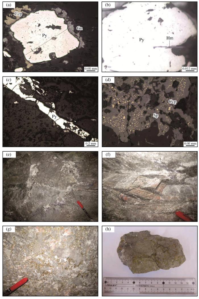 (a)方铅矿沿边缘交代黄铁矿;(b)针状钛铁矿穿插黄铁矿;(c)黄铁矿被脉石矿物错断,呈交代残余结构;(d)黄铜矿呈乳滴状分布在闪锌矿颗粒中,形成固溶体分离结构;(e)矿脉;(f)矿体中方铅矿,黄铁矿顺条带或呈不规则细脉产出;(g)黄铁矿呈细脉网格状产出;(h)角砾状构造;Py-黄铁矿;Ccp-黄铜矿;Gn-方铅矿;Sp-闪锌矿;Hm-钛铁矿