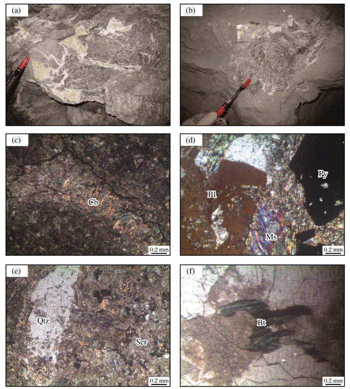 (a)铁白云石化;(b)黄铁绢英岩化;(c)碳酸盐化;(d)黄铁矿化;(e)绢云母化;(f)绿泥石化