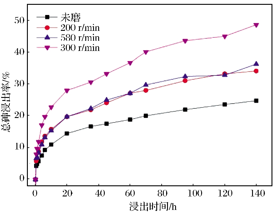 Fig.10. Relationship between leaching rate of total arsenic and leaching time under different milling speeds |