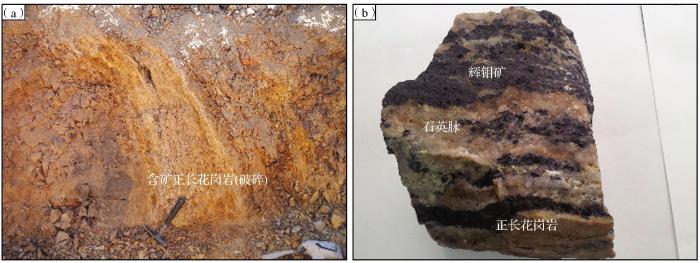 Macroscopic(a) and hand specimen (b) photographs of molybdenum bearing syenogranite from Xiaozaohuo area