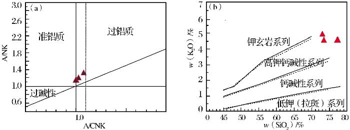A/NK-A/CNK 分类图解(a)和SiO2-K2O图解(b)