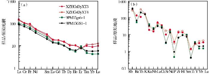样品一~样品四的编号分别为XZHGsDyXT3、XZHGsDyXT4、9PM15GS6-1和9PM15GS1-1;表中主量元素含量由XRF-1500测定,单位为%;微量及稀土元素含量由ICP-MS测定,单位为×10-6;N为球粒陨石标准化Sun and MeDoungh[