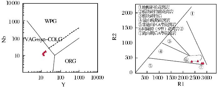 (2)岩石地球化学研究表明该岩体具有富硅钾的特点,属高钾钙碱性和准铝质—弱过铝质岩石系列;具有较弱的Eu负异常(0.75~0.86),Nb、Ta、Ti、P、Ba等元素亏损和Rb、Th、U、K等元素富集,Rb/Sr比值平均为1.90,Nb/Ta比值平均为11.33,均反映了岩石的壳源成因。