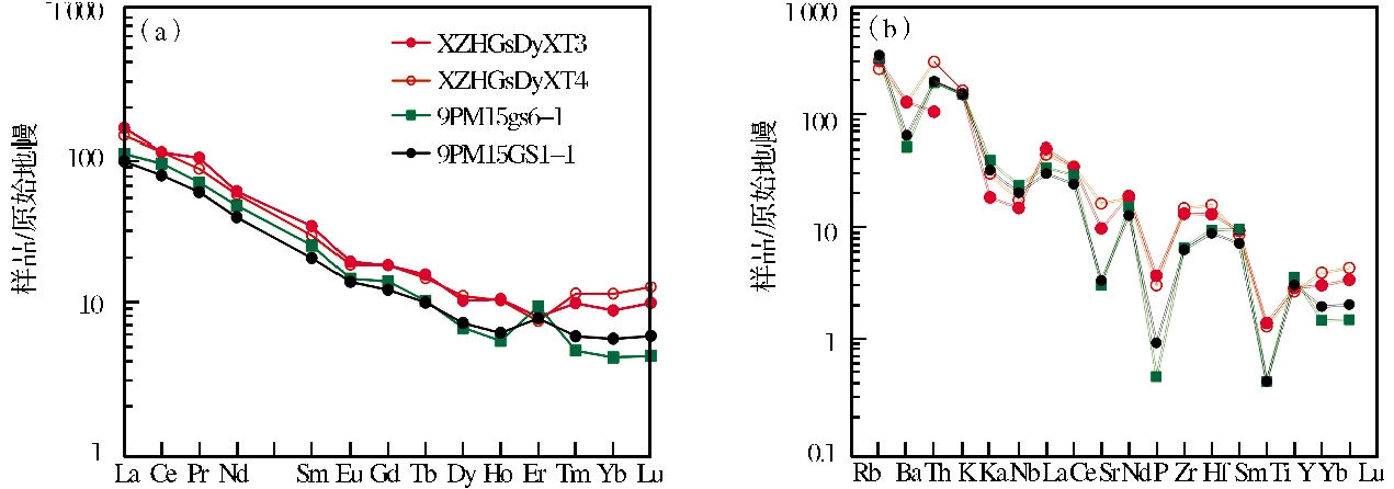 | Fig.6 Chondrite-normalized REE diagram (a) and primitive mantle normalized trace element spider-diagram(b) |