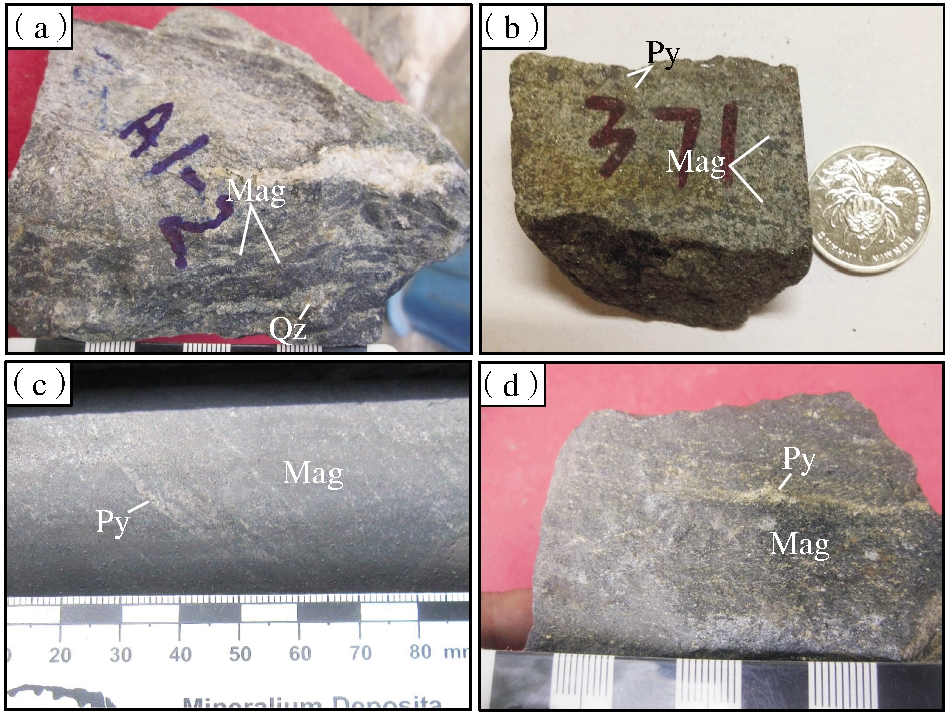 | 图4 赞坎铁矿矿石类型 (a)条带状矿石;(b)浸染状矿石,黄铁矿呈浸染状分布;(c),(d)块状矿石,黄铁矿呈纹层状分布 Py-黄铁矿;Mag-磁铁矿;Qz-石英 |