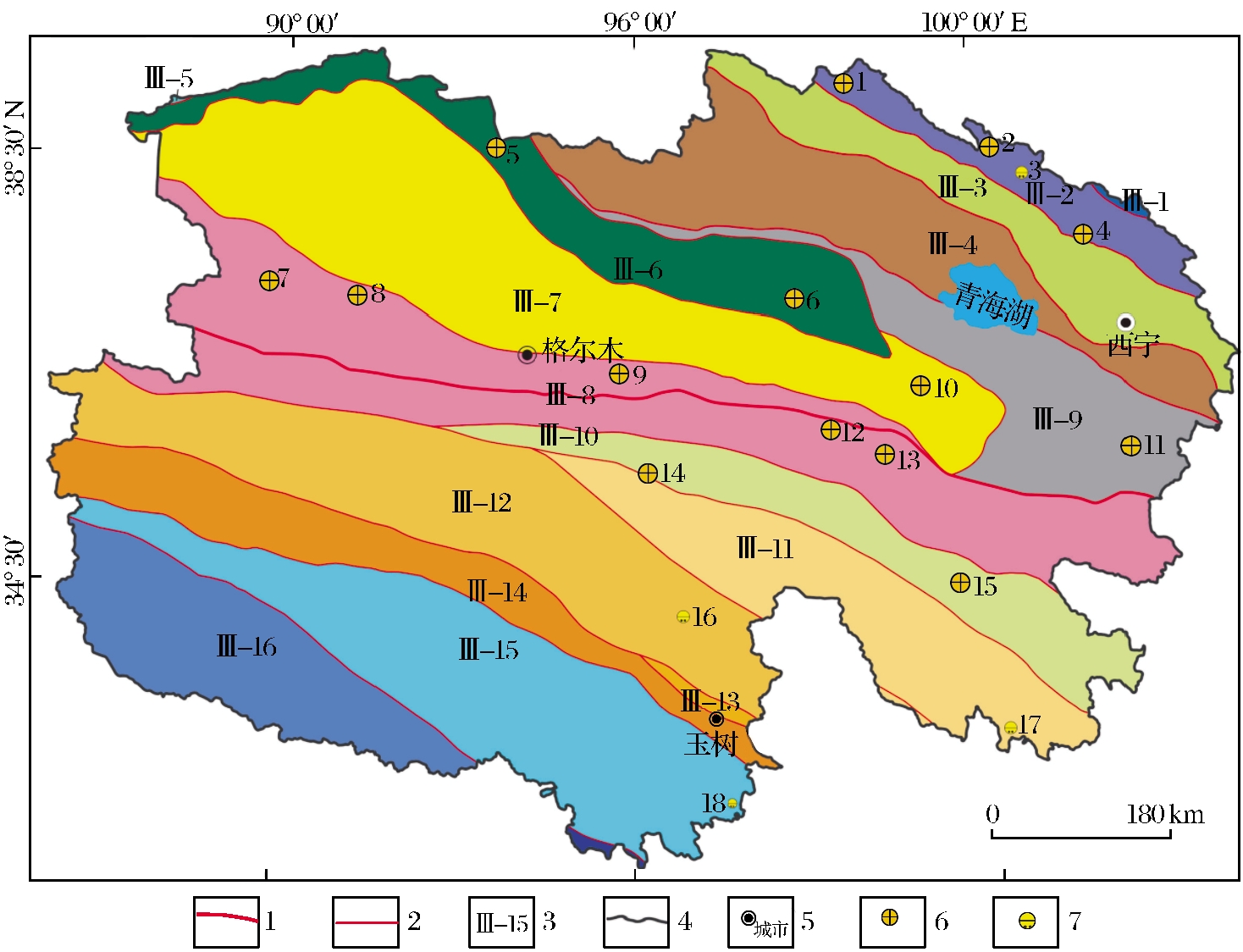 | 图1 青海省Ⅲ级成矿带及金矿分布图 1 成矿域界线;2.成矿带界线;3.成矿带编号;4.省界;5.地名;6.岩金矿(1-红川金矿;2-西山梁金多金属矿;4-松树南沟金矿;5-滩间山金矿;6-赛坝沟金矿;7-肯德可克铁多金属矿;8-它温查汉西铁金多金属矿;9-五龙沟金矿;10-满丈岗金矿;11-瓦勒根金矿;12-果洛龙洼金矿;13-坑得弄舍金多金属矿;14-大场金矿;15-东乘公麻金矿);7.砂金矿(3-天朋河砂金矿;16-扎朵砂金矿;17-吉卡砂金矿;18-草曲下游砂金矿) |