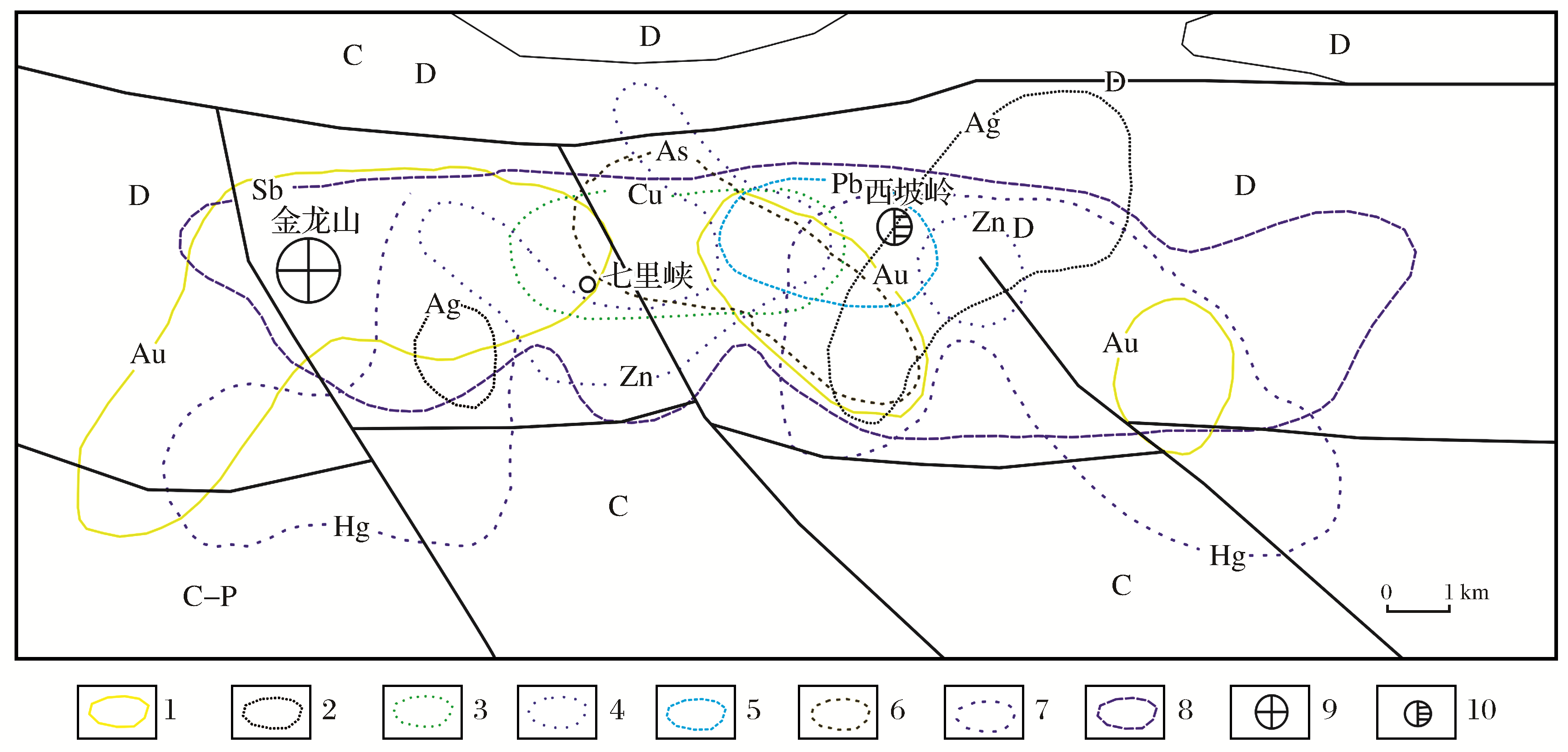 | 图4 丁—马矿带金、砷、锑、汞等元素1/5万化探异常图[ |