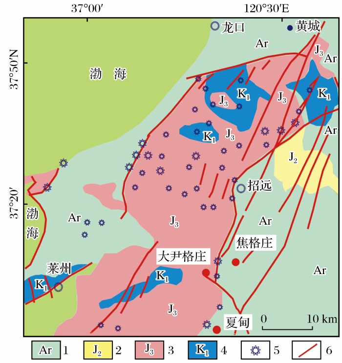 招平断裂带中段地处华北板块胶北隆起区[1],是著名的金矿成矿带和我国金矿富集区之一[2,3,4,5,6,7,8,9],控制着夏甸、大尹格庄、姜家窑和焦格庄等不同规模的金矿床。前人已对胶东地区大部分金矿床的形成机制(如,幔源C-H-O流体分异、减压增温体系)[10,11,12,13,14,15,16,17,18,19,20,21,22,23,24,25,26]、成矿时代[27,28,29]、物质来源(如,幔源和壳源及壳幔混合源)[10,11,12,13,14,15]、区域成矿带划分和主要地质体与金矿化的时空关系(混合岩化、岩浆热液成矿、大陆地壳深部成矿和煌斑岩辅助成矿)[16,23,26]进行了研究,但对于招平断裂带中段金矿床的构造控矿条件、矿床分布规律及矿体赋存规律仍缺乏较详细的认识。因此,本研究主要从区域地质特征、金矿床地质特征、构造控矿特征和金矿成矿规律等方面入手进行探讨,为上述存在的科学问题提供合理的解释,同时有望为后期找矿提供可能的指导。