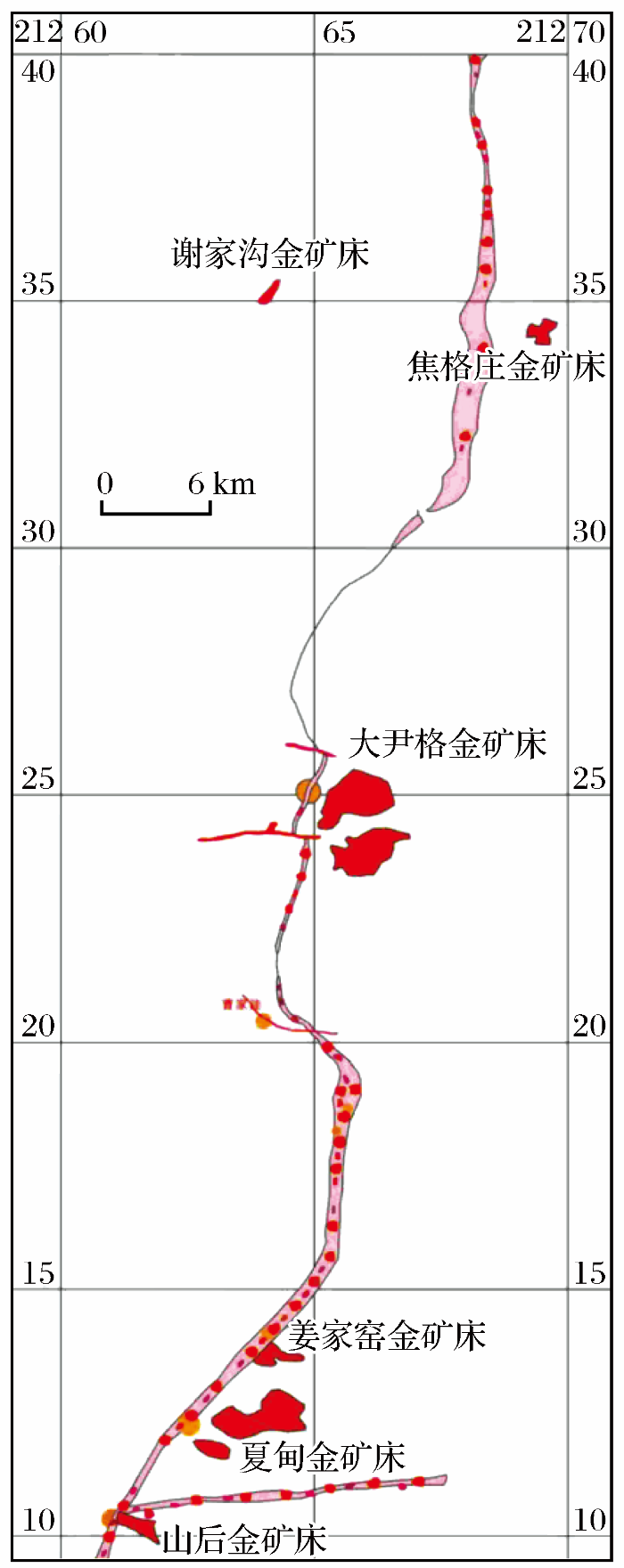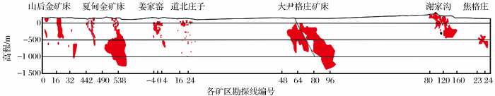 招平断裂中段已查明的金矿床共10余处。本研究主要涉及大尹格庄特大型金矿床、夏甸特大型金矿床和焦格庄小型金矿床。