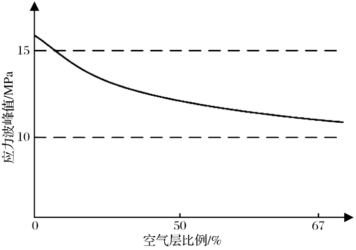 为分析空气间隔装药爆破技术的作用机理,岳中文等[16 ] 研究了水泥砂浆中切缝药包空气间隔装药爆破的动态响应,得到空气间隔装药相比连续装药,空气柱起到了缓冲和储能的作用,轴向不耦合系数在1.5~2.0之间的爆破效果较好;池恩安等[17 ] 通过现场试验对最佳空气层比例进行了选取;吴亮等[18 ] 验证得到空气间隔装药可以避免连续装药爆破的缺点;王凯等[19 ] 采用中部空气间隔装药代替连续装药,并对空气间隔比例进行对比研究,得到空气间隔层比例为17.5%的中部空气间隔装药爆破效果最佳。空气间隔装药中空气间隔层比例与应力波峰值、正压作用时间的关系曲线如图1 和图2 所示。