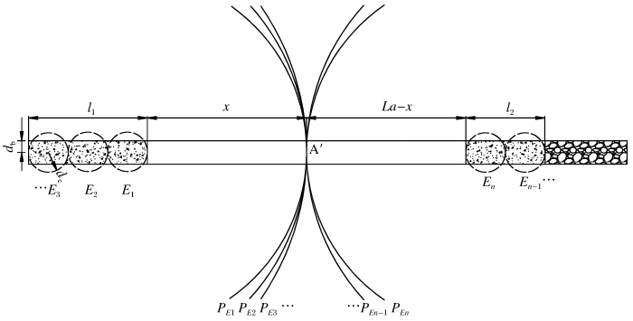 式中:K = 1 . 97 δ ρ e W S / W T δ / 3 B 。按照Starfield迭加法,两装药段可分别等效为n 1 = 6 l 1 / 3 d c 、n 2 = 6 l 2 / 3 d c 个等效单元球形药包。要计算空气段内任意一点的冲击压力,假设某点为A 点,其与下部装药段的距离为x ,与上部装药段的距离为(La -x ),则下部装药段产生的冲击压力传到第i 个单元球形药包(i 从装药段顶部到底部依次增大)时,该球形药包在A 点的冲击压力表示为