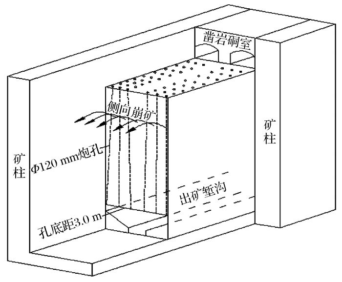 某矿区采区矿体容岩及顶板围岩主要为中细粒花岗岩和次隐爆角砾岩,少量为英安玢岩,矿石类型为原生矿。采用大直径深孔阶段空场嗣后充填采矿法的矿房垂直布置,分段长50~75 m,高50 m,宽16 m,阶段高100 m。在矿房中部利用垂直深孔球状药包后退式崩矿方法(VCR法)拉槽形成自由面和补偿空间,炮孔直径为120 mm,孔底距为3.0 m,排距为3.5 m,空孔直径为250 mm。掏槽孔孔径不变,使用直径为100 mm的乳化炸药药条装药,毫秒延期电雷管,孔口堵塞长度取1 m,孔底堵塞长度取1 m,然后采用侧向崩矿,每次爆破3~4排炮,逐孔起爆,孔深10~18 m。底部采用堑沟出矿,炸药单耗为0.46 kg/t。由于前排炮的爆破后冲作用突出,常造成后排未爆炮孔堵塞、垮塌破坏,从而使得爆破大块增多,同时爆破生产的爆破振动与冲击大,邻近的矿柱矿房也出现较多裂隙,甚至影响后续施工及放炮。采矿工艺如图4 所示。