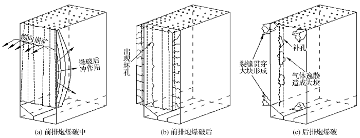 现场侧崩爆破过程中,常出现前排炮孔堵塞、垮塌破坏、振动大和爆破后大块多等问题。现场跟踪调查分析之后可知,造成上述现象的原因有:采用连续装药结构爆破,产生的振动与冲击大,冲击作用强,造成下次爆破时前排炮孔的堵塞、破坏现象严重,需要进行补孔;补孔后,爆生气体和大量次生裂缝易产生大块。侧崩爆破形成大块的过程如图5 所示。