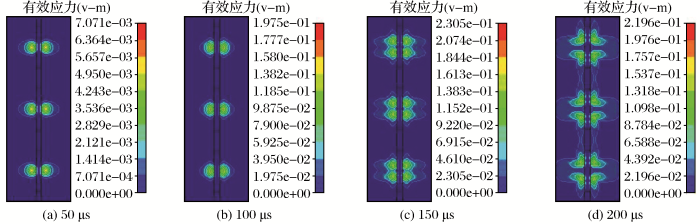 为了较直观地观察爆炸情况,截取模型A不同时刻的炮孔轴向有效应力云图,如图8 所示。