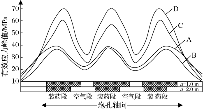为比较各方案炮孔内的爆炸应力场,提取模型从孔底至孔口炮孔全长的监测点相关应力数据,将所获取的单元有效应力峰值数据绘制成图,如图9 所示。由图9 可知:①应力峰值呈现为在装药段处最大、空气段处减小及空气段中部应力最小的规律,该模型试验结果验证了理论分析。②对方案B和方案C的有效应力峰值进行比较,整体上方案C高于方案B,说明单元有效应力峰值的变化受间隔空气柱长度的影响,空气柱越长,则有效应力越小。③分别比较方案A与方案B,方案C与方案D的有效应力峰值,总体上方案A的有效应力值大于方案B,方案D的有效应力值大于方案C,说明单元有效应力峰值的变化受装药长度的影响,有效应力随装药量的增大而增大。④整体上方案D、方案C、方案A和方案B的有效应力值依次减小,说明有效应力峰值主要受空气柱长度的影响,其次受装药长度的影响。⑤方案A与方案B的曲线变化幅度较平缓,方案C与方案D的曲线变化幅度较剧烈,说明有效应力分布随着间隔空气柱的增长而趋于稳定,爆炸能量分布越均匀。