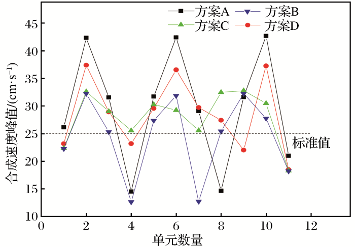 ... 进一步比较各方案在崩矿自由面上的实际爆破效果,提取自由面上相同位置单元的合成速度峰值进行分析,如图11 所示.由图11 可知:①比较各单元合成速度峰值,方案A与方案B部分单元合成速度峰值较小,远远小于临界值25 cm/s[23 ] (认为合成速度在25 cm/s以上破坏效果明显),而方案C与方案D大部分单元合成速度峰值在临界值上.②比较方案C与方案D,方案D各单元合成速度峰值变化较剧烈,即振动速度差值较大,故方案D在自由面上的破坏效果更好. ...