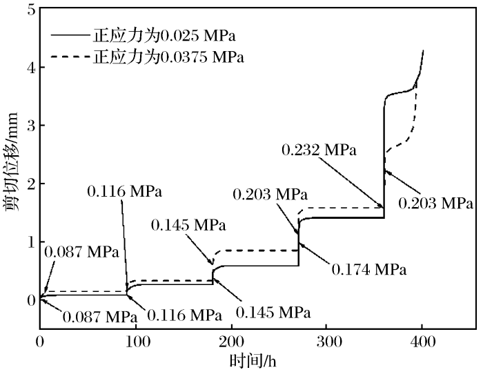 采取分级增量加载方式对砂卵石土进行剪切流变试验。试验时先对2组试样各施加0.025 MPa和0.0375 MPa的法向应力,稳定在24 h以上。然后由低到高分级分时段施加剪应力,当24 h内流变的位移量小于等于0.001 mm时,认为变形相对稳定,可施加下一级剪切应力。如此进行下去,直至试件发生破坏。