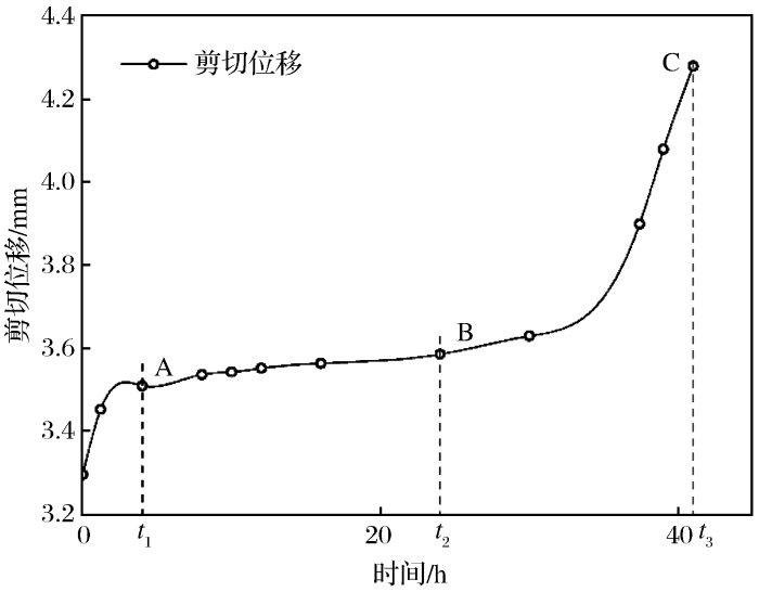 由图2可知,当剪切应力刚开始作用于砂卵石土时,试样发生瞬时弹性变形,流变表现出弹性特性,此阶段为瞬时弹性变形阶段。0-t1阶段,为砂卵石土的初始流变阶段,此阶段剪切流变速率以减速发展。t1-t2阶段,为稳态流变阶段,变形速度大体保持不变。在0-t2阶段,岩石剪切流变位移随着时间的增加而增加,表现出流变具有黏性特征。t2-t3阶段为加速流变阶段,变形速度出现突增,突出表现塑性特征,试样在此阶段发生破坏。总结可知,在瞬时弹性变形阶段、初始流变阶段和稳态流变阶段,流变表现出黏弹性特征;而在加速流变阶段,流变表现出黏弹塑性特征。