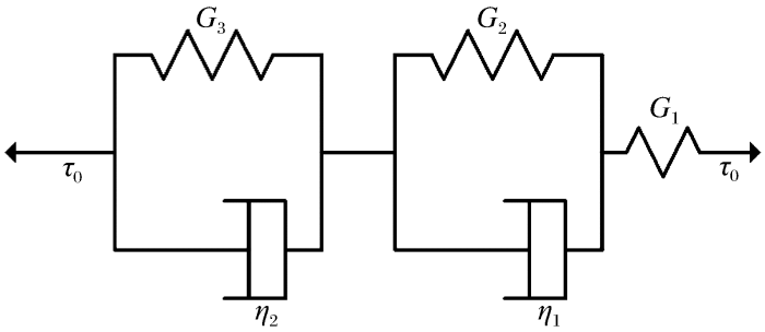 式中:u(t)为砂卵石土总的剪切位移;G1为瞬时剪切模量;G2和G3均为黏弹性剪切模量;η1和η2均为黏滞系数,表示流变阶段趋向稳定的快慢程度,数值越小,则趋向稳定的时间就越短;t为砂卵石土在该剪切应力作用下的流变时间;τ0为剪应力。