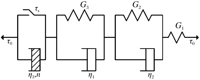 (3)当剪应力大于长期强度且流变进行到了加速流变阶段时,串联模型中各元件都发挥作用,流变方程为