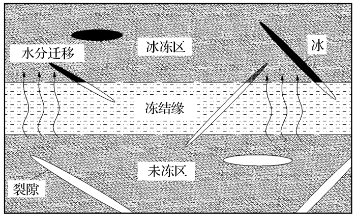 ... (3)毛细管理论.Everett[31]基于热力学平衡原理提出了毛细管理论,后来得到了试验验证.该理论认为无冻胀区域的水—冰界面处于动态平衡状态,由于能量转移、温度变化和表面张力差异等因素影响,原本的平衡体系被打破,孔隙间形成压力差.在压力差作用下,分凝机制运行,岩石内部水分开始迁移.毛细管理论虽然指出了水分迁移驱动力来源,但无法诠释不连续冰透镜体的形成过程. ...