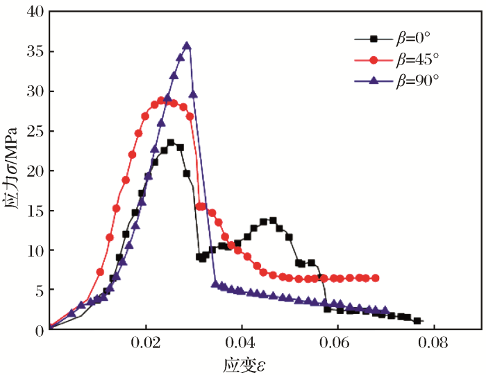 (2)由图7可知,当β=0°时,试件应力—应变曲线为双峰曲线,且第二个峰值强度均小于第一个峰值强度,表现出一定的屈服性。这是由于试件在加载过程中先后产生了2组拉伸裂纹,当第一组裂纹发育完成后,试件承载结构并未完全破坏,但应力出现明显的跌落,之后荷载继续增加,随着第二组裂纹的萌生和扩展,应力再次发生跌落,因此2次应力降分别代表着先后2组裂纹的发育及扩展,符合前文所述的A型破坏模式。随着β的增大,当45°≤β≤90°时,试件的应力—应变曲线逐渐变为单峰曲线。峰值后曲线由平缓逐渐变为高陡,这说明试件破坏时的脆性增强,延性减弱,其中当β=90°时,试件峰值后曲线几乎呈垂直形式,说明其脆性破坏特征最为明显,这与前文中试件破坏模式的分析一致。