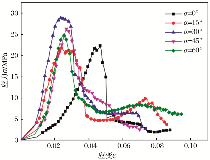 (1)所有试件应力—应变曲线均经历了裂隙压密、弹性变形、塑性变形和破坏后4个阶段,且同一倾角条件下的试件应力—应变曲线形式类似。