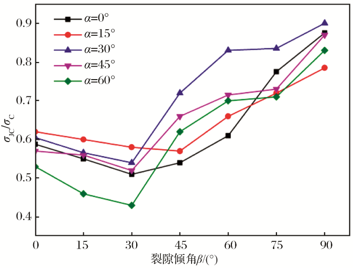 (2)随着裂隙倾角的增大,试件的延性减弱,脆性增强;剪切裂纹面的颗粒摩擦是产生残余强度的主要原因。裂隙的起伏在一定程度上分担了裂隙主倾角上的应力,对试件的形变及抗压强度有一定的影响。