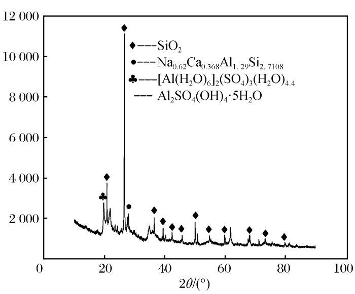 膨润土是一种主要由蒙脱石组成的岩土矿物,其中的蒙脱石与早期水化过程中生成的钙矾石(AFt)和凝胶(C-S-H)[13 ,14 ] ,在干湿状态具有很强的吸水和膨胀特性。在膨润土浸水完成时,每蒙脱石单元吸水量为常数[15 ] ,定义膨润土中的蒙脱石孔隙率是实验样品中水的体积与浸水完成后蒙脱石固体颗粒体积之比,当水浸膨胀稳定时,用于表征蒙脱石每单位体积的吸水率。图1 是膨润土的XRD衍射图,由图可知其主要成分为SiO2 、Al2 O3 、Fe2 O3 和CaO等。