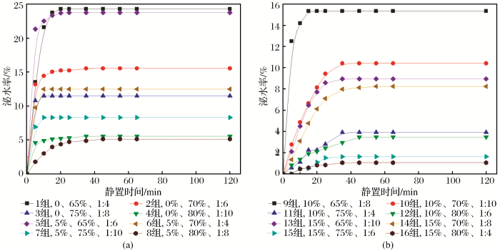 (2)观测并记录试验数据。严格按照泌水率测试操作步骤,如实记录对应时刻和对应试验相关组的泌水量,测试各组泌水率的过程中,对每组泌水量进行动态读数。试验结束后,根据式(1)和式(2)计算得到充填料浆总泌水率与动态泌水率。