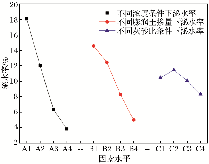 (1)当提高料浆浓度或膨润土掺量时,总泌水率降低,但减小灰砂比时总泌水率呈现出先升高后降低的趋势。在一定的变化范围内,总泌水率与各因素呈反比关系,且料浆浓度对料浆总泌水率的影响最大,其次是膨润土掺量,灰砂比最小。